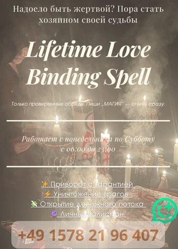 ЖЕСТКИЕ И МОЛНЕИНОСТНЫЕ ВОЗДЕЙСТВИЯ! LOVE SPELL MAGIC- ОБРЯДЫ И РИТУАЛЫ ЛЮБОВНОЙ МАГИИ. ЧЕРНАЯ И БЕЛАЯ МАГИЯ, ВУДУ ОБРЯДЫ. ЗАКЛИНАНИЕ НА СИЛЬНУЮ ЛЮБОВЬ! Контакты: ПИСАТЬ В Telegram: WhatsApp [+49 1578 2196407] Email: [koldun. alex1977@gmail. com] Только личные встречи в NRW (Эссен/Берлин). Онлайн-консультации Устали биться головой о стену? Пора решить проблему раз...