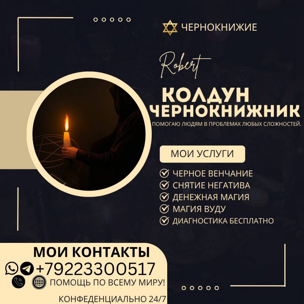 Потомственный чернокнижник Роберт Вячеславович – ваша надежда на решение самых сложных проблем. Опытнейший практик с 18-летним стажем предлагает мощные обряды черной магии для достижения желаемого результата.