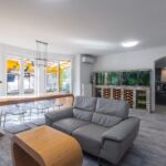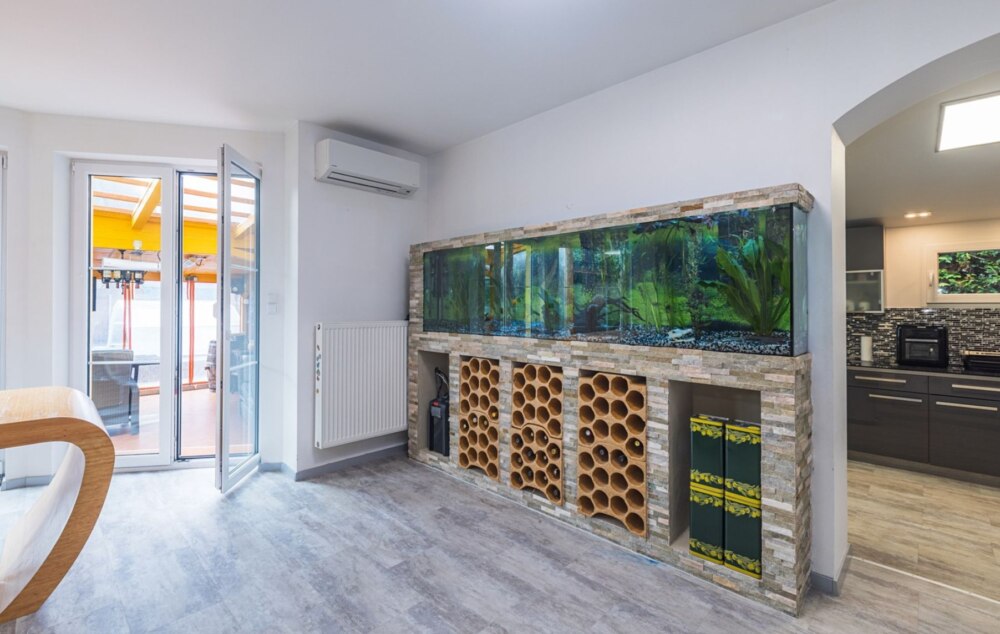 • просторную гостиную с аквариумом на 600 л для тропических рыб и зоной для хранения вина;