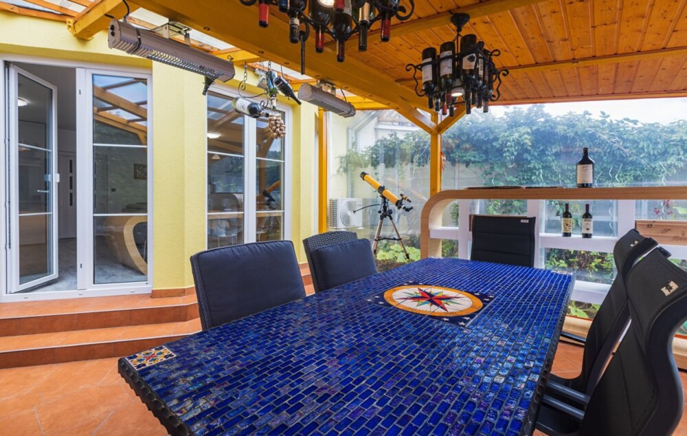 терраса отапливается тепловым насосом и инфракрасными обогревателями и служит продолжением жилой зоны дома;