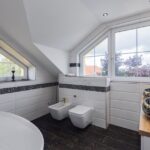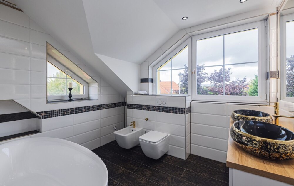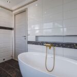 • полностью оборудованную ванную комнату: душевая кабина, биде, писсуар и большое количество мест для хранения.