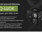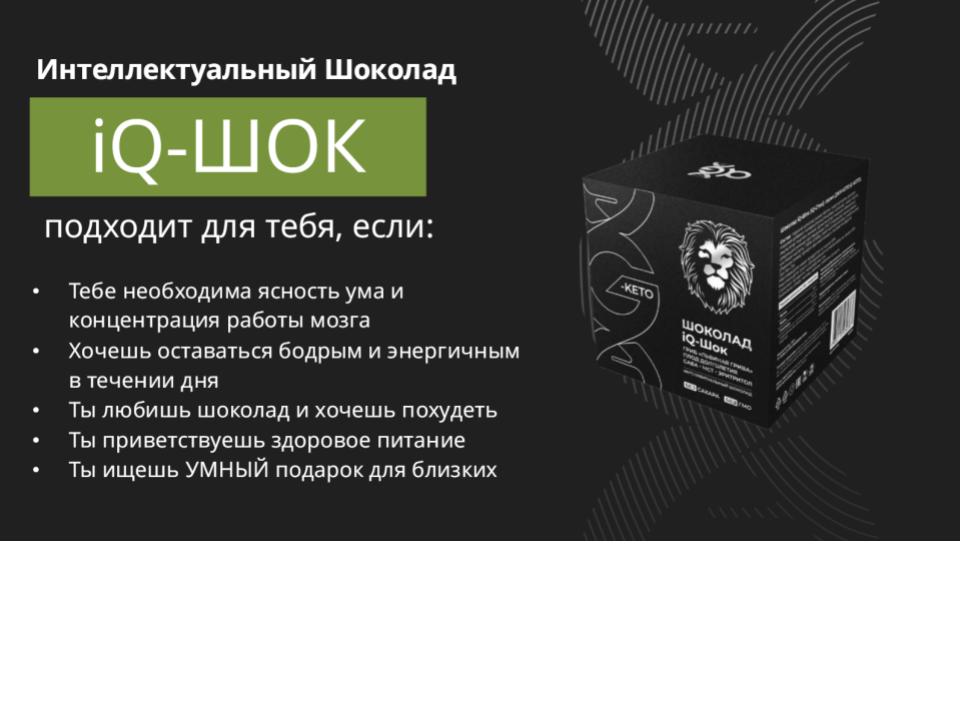 Интеллектуальный шоколад iQ-ШОК — это темный шоколад (> 65%) из отборных какао-бобов — благотворно действует на мозг, на концентрацию и память. Ускоряет реакцию. Позволяет справиться с депрессией и снять эмоциональное напряжение. iQ-ШОК содержит гриб Львиная грива, который полезен для улучшения когнитивных функций. ГАМК в составе шоколада усиливает нейропластичность — способность мозга меняться и адаптироваться. Масло МСТ насыщает энергией мышцы и мозг. iQ-ШОК не содержит сахар. В составе — два бескалорийных безопасных и полезных подсластителя: эритрит и экстракт Ло Хан Го (плод Долголетия).