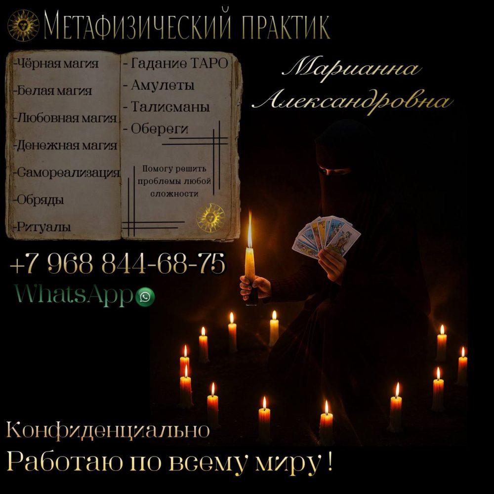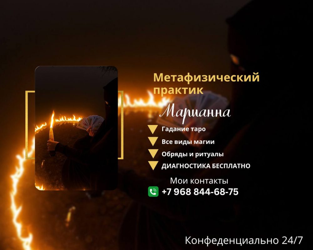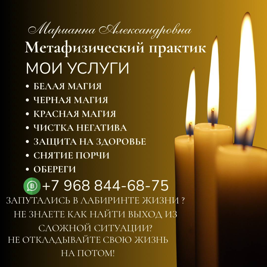 Метафизический практик Марианна Александровна – ваш проводник в мир магии и гармонии! Запутались в жизненных проблемах? Не знаете, как принять верное решение? Марианна Александровна, опытный и потомственный метафизический практик, обладает глубокими знаниями и многолетним опытом в сфере магии и эзотерики, чтобы помочь вам! ДИАГНОСТИКА БЕСПЛАТНО ! +7 968 844‑68‑75 WhatsApp Гадание на...